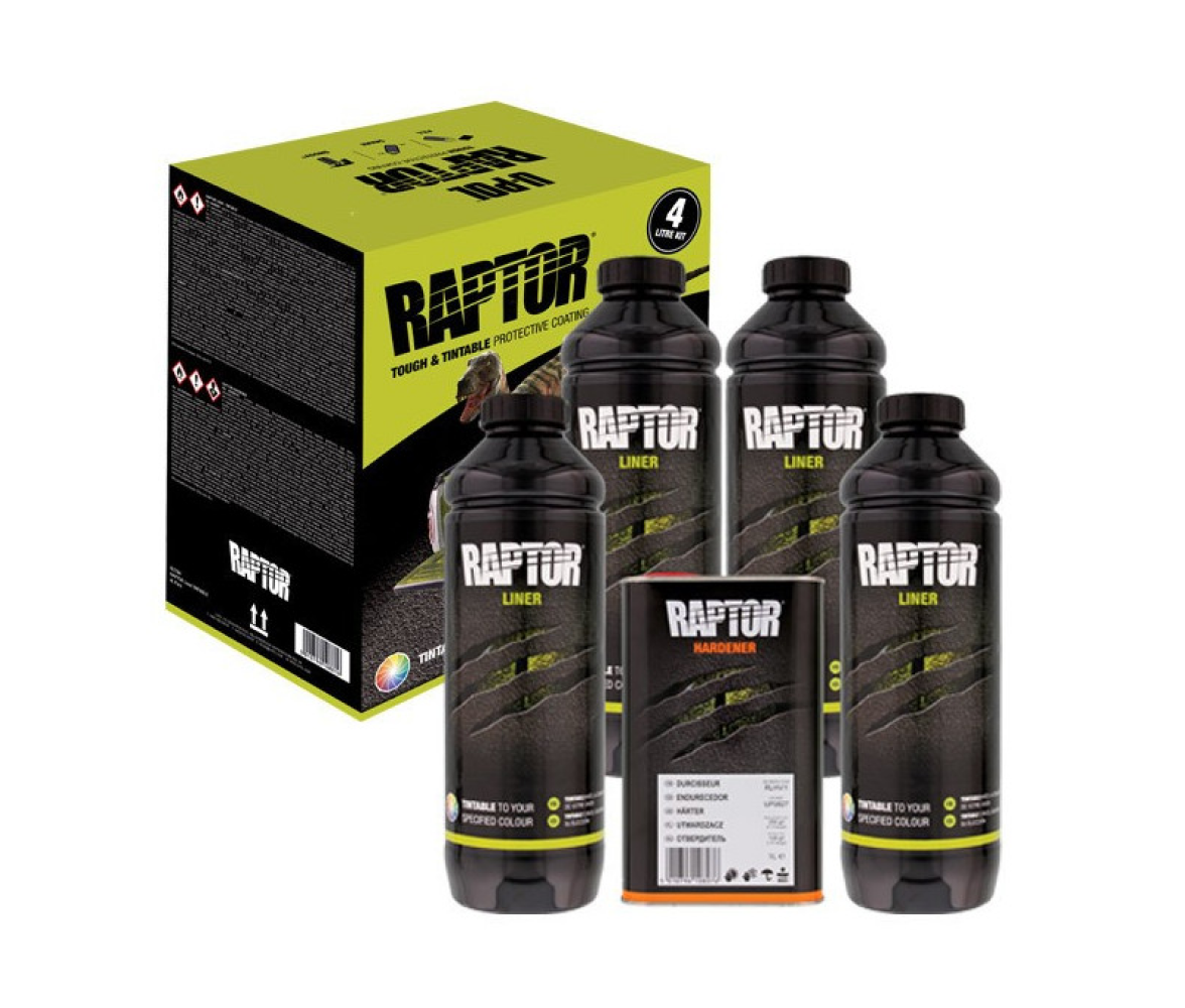 O kit 4 Bottle RAPTOR é o padrão da indústria em revestimentos de revestimentos de cama. Cada kit contém 4 frascos de RAPTOR e uma lata de endurecedor. Disponível em preto e em “pintável”.